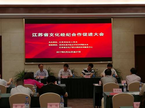 5月26日下午,大會首個主題“全省文化經紀合作工作會議”在吳中區蘇苑飯店舉行,蘇州市吳中區文學藝術家聯合會主席致歡迎詞,江蘇省經紀人協會文化經紀專委會、省文交所股權交易中心負責人季庚林受秘書處之托,介紹了本次大會的具體計劃和安排,并對2017年度文化經紀合作工作規劃和工作重點作了匯報。會上,為參會單位進行首輪推宣和介紹。