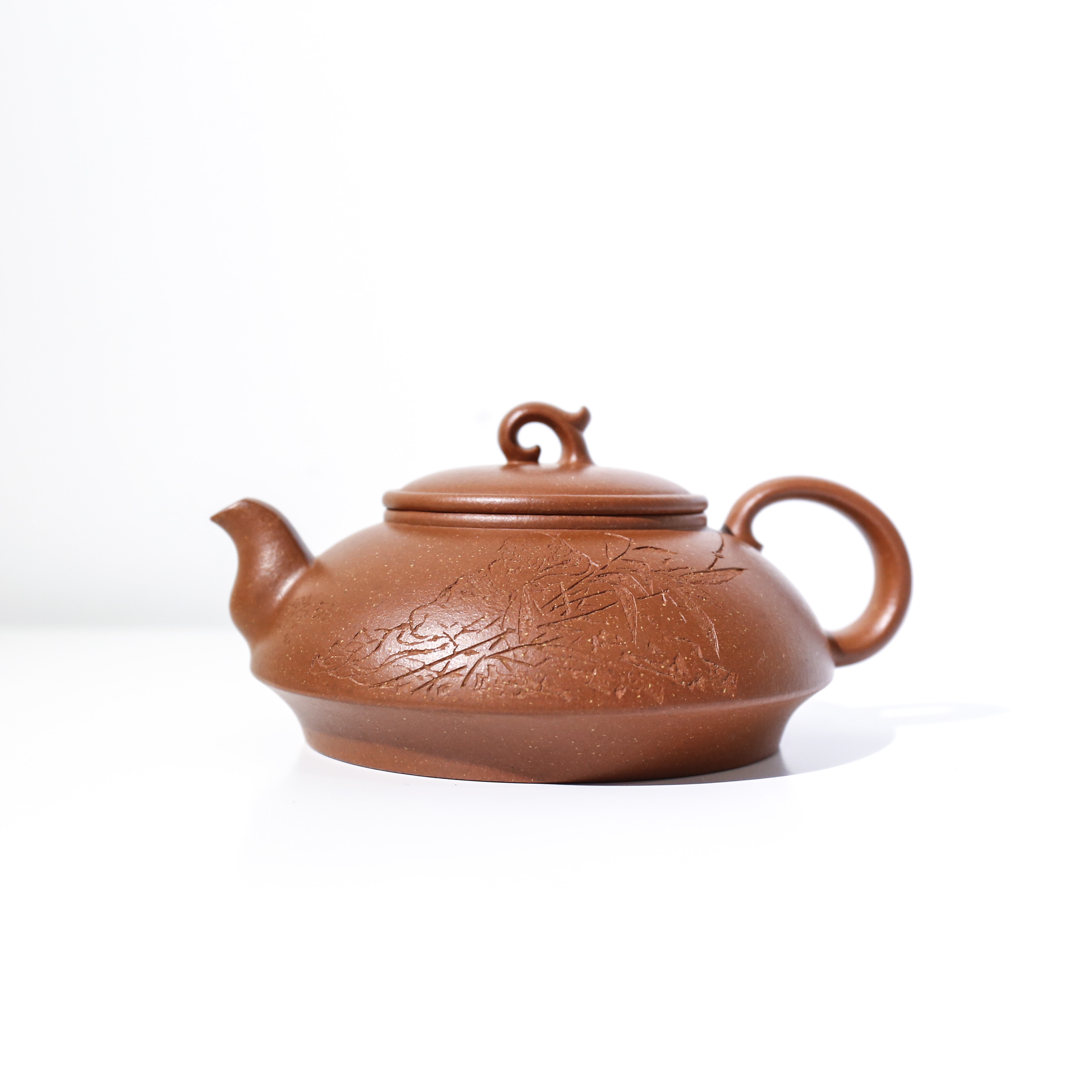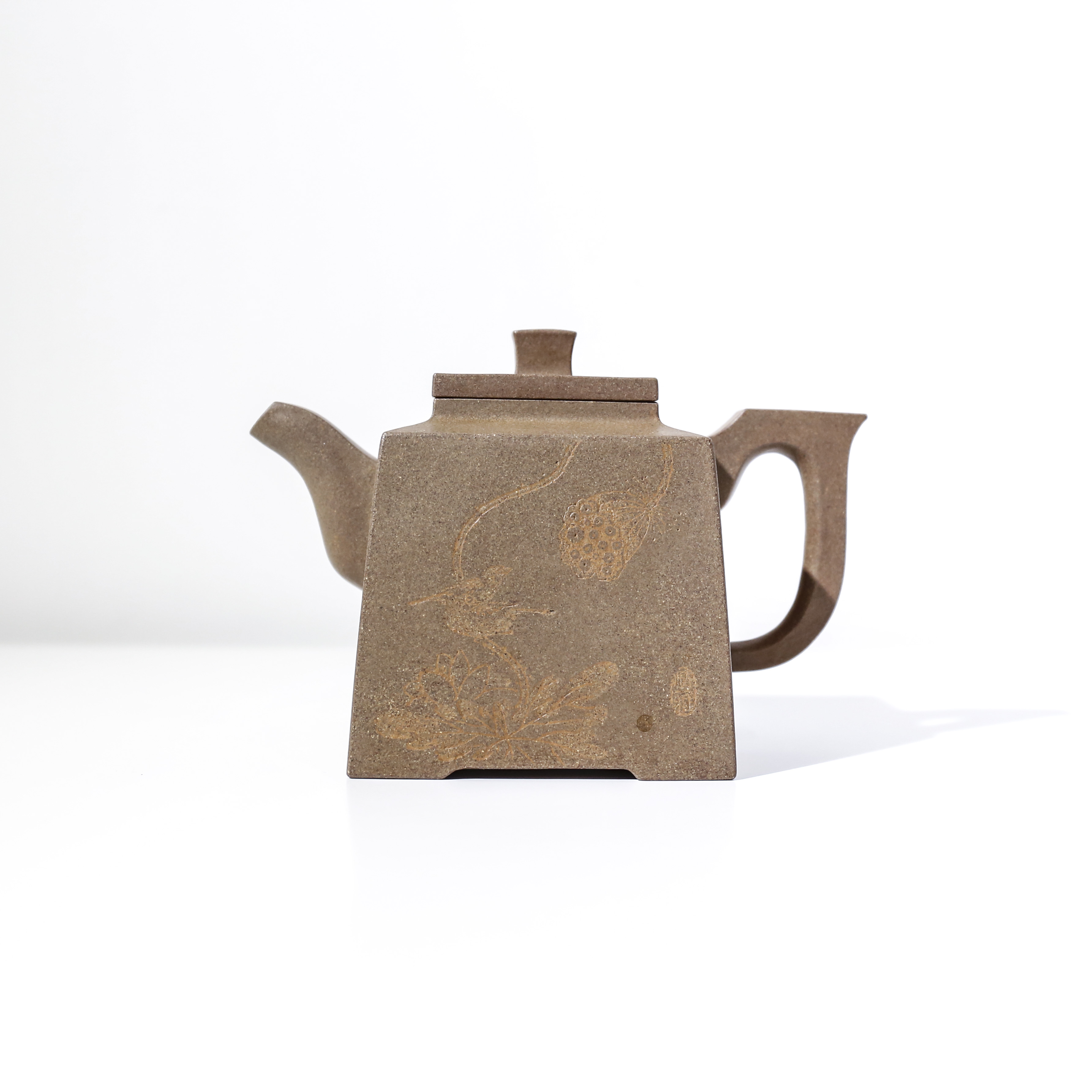 此作品選用了明清磚色泥料,并融入明清時期的線條感,線條中既有弧度,又不失穩(wěn)重、大氣。壺身一面配有詠荷雅句,另一面刻有一枝若隱若