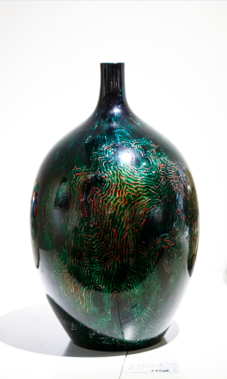 大漆作品《藏石》,以宜興紫砂為胎體,結(jié)合傳統(tǒng)大漆工藝,經(jīng)由作者當代審美設計,使兩種古老技藝重煥生機。作品富有創(chuàng)意地將紫砂與大漆裝飾相結(jié)合,通體幽靜,設計巧妙,制作精良,是不可多得的精品。