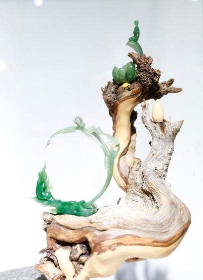 該作品創(chuàng)作靈感源于邊角料的極致運用,整套作品的設計更跳脫以往一貫的思路,將玉器的設計視野擴大到整體的擺設背景,將全面的視覺張力延伸,更強地展現(xiàn)作者想表現(xiàn)的意境。